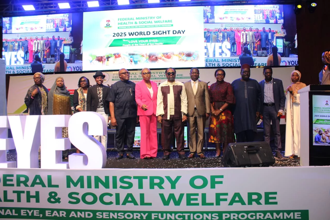 Members of National Coordinating Committee, National Eye, Ear and Sensory Functions Programme in a group Photograph with Cobahms Asuquo (wearing…