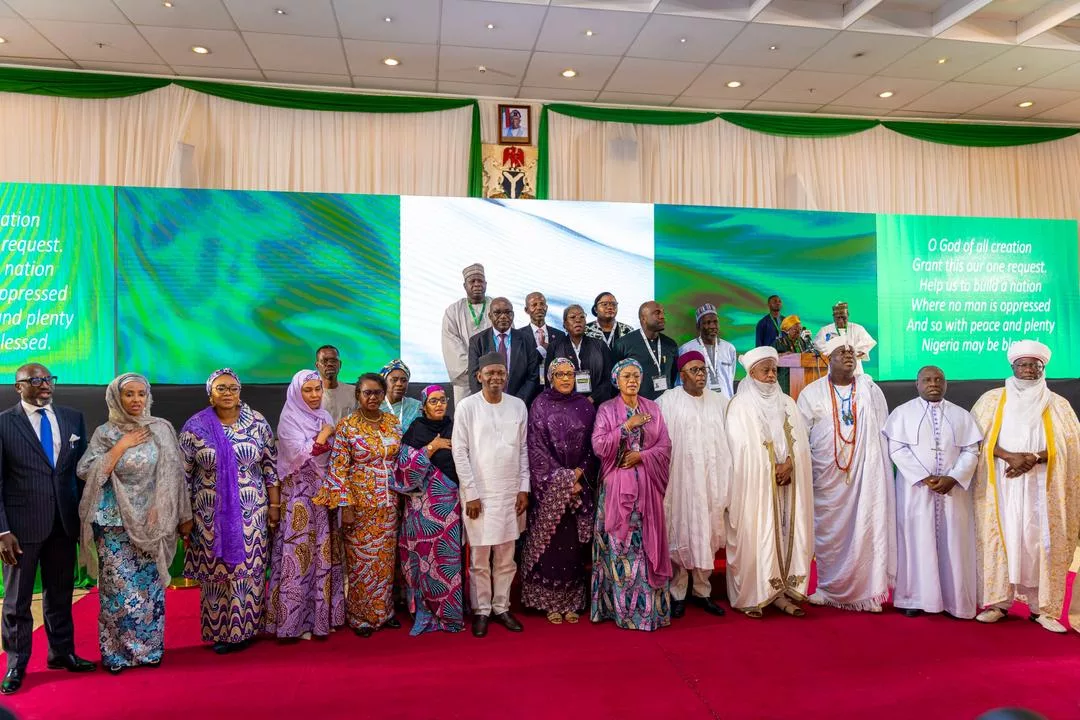 Middle: The First Lady Oluremi Tinubu CON.To her Right: Wife of the Vice-President, Hajiya Nana Kashim Shettima; To her Immediate…