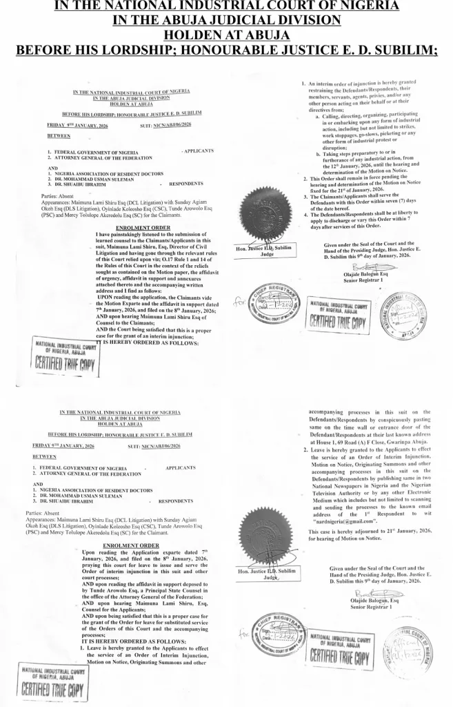 • NATIONAL INDUSTRIAL COURT INTERIM ORDER ON NARD’S 12TH JAN. 2026 PLANNED STRIKE